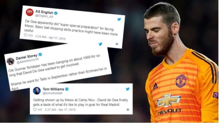 แฟนบอลของทีมอื่นๆ ล้อเลียน ดาบิด เด เคอา ผู้รักษาประตูมือหนึ่งของ แมนเชสเตอร์ ยูไนเต็ด กันอย่างเต็มที่ หลังจากที่เขารับลูกพลาดจนทำให้ทีมเสียประตู ในเกม ยูฟ่า แชมเปี้ยนส์ ลีก รอบก่อนรองชนะเลิศ นัดสอง ที่ต้นสังกัดของเจ้าตัวออกไปแพ้ บาร์เซโลน่า 0-3 ที่สนาม คัมป์ นู เมื่อวันอังคารที่ 16 เมษายน ที่ผ่านมา
