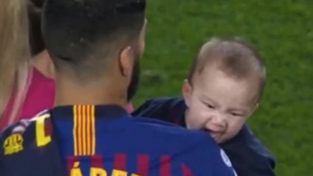 ระหว่างที่นักเตะ บาร์ซ่า ฉลองแชมป์ ลา ลีกา สเปน หลังเอาชนะ เลบานเต้ 1-0 ที่สนาม คัมป์ นู เมื่อวันเสาร์ที่ 27 เมษายน ที่ผ่านมานั้น ซัวเรซ ได้พาลูกชายมาฉลองด้วย ก่อนที่เจ้าหนู เลาตาโร่ จะงับเข้าที่ไหล่ของคุณพ่อ