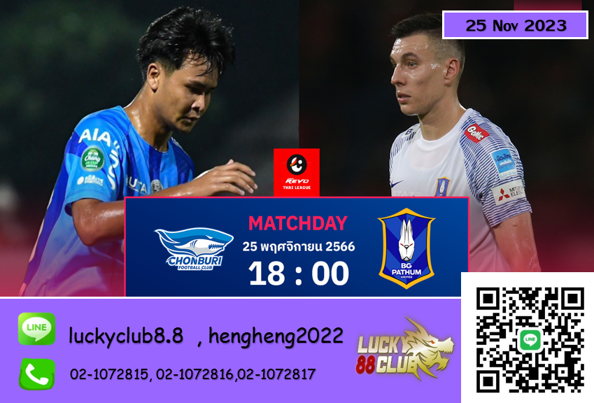 การแข่งขันฟุตบอลไทยลีก ฤดูกาล 2023-24 นัดที่ 11 ประจำวันเสาร์ที่ 25 พ.ย. 2566  ที่ ชลบุรี ยูทีเอ สเตเดี้ยม จ.ชลบุรี เวลา 18.00 น. “ฉลามชล” ชลบุรี เอฟซี ทีมอันดับ 13 ที่มี 10 แต้มจาก 9 นัด เปิดบ้านรับมือ “เดอะ แรบบิท” บีจี ปทุม ยูไนเต็ด ทีมอันดับ 3 ที่มี 18 แต้มจาก 9 นัด ถ่ายทอดสด AIS PLAY,TrueVisions(TrueVisions NOW) และ 3BB GIGA TV