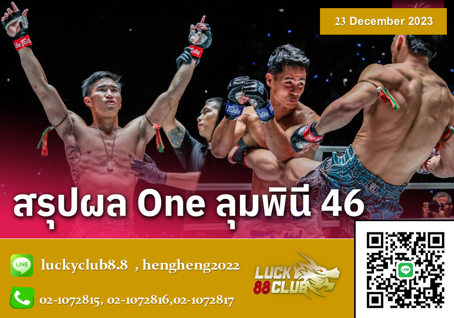 ศึก ONE ลุมพินี 46 ระเบิดความมันสุดยิ่งใหญ่สมเป็นรายการเดือดส่งท้ายปีให้แฟนกีฬาต่อสู้ได้ลุ้นเชียร์ระทึกตลอดทั้งการแข่งขัน เมื่อค่ำคืนวันศุกร์ที่ 22 ธ.ค.ที่ผ่านมา ที่สนามมวยเวทีลุมพินี (รามอินทรา) โดยมีเหล่านักสู้ชั้นยอดบู๊กันทั้งสิ้น 11 คู่ เดินลุยโชว์ฝีมือสุดความสามารถให้ทุกคนได้ประทับใจ