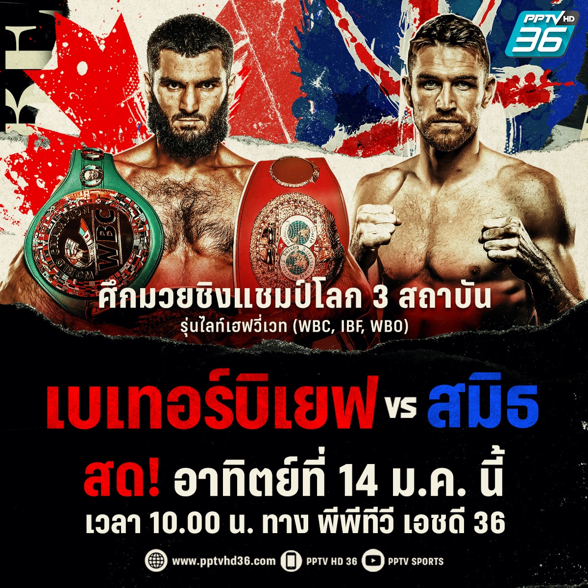 พีพีทีวี เอชดี ช่อง 36 ชวนแฟนกีฬาร่วมมันส์สะใจประเดิมต้นปี 2567 ถ่ายทอดสดศึกมวยชิงแชมป์โลก 3 สถาบัน รุ่นไลท์เฮฟวี่เวท (WBC, IBF, WBO) เมื่อ “คิงอาร์เธอร์” อาเธอร์ เบเทอร์บิเยฟ ขึ้นสังเวียนชกป้องกันเข็มขัดแชมป์กับ คัลลัม สมิธ ในวันอาทิตย์ที่ 14 ม.ค. นี้ เวลา 10.00 น. ณ วิเดโอตรอน เซ็นเตอร์ ควิเบกซิตี้ ประเทศแคนาดา
