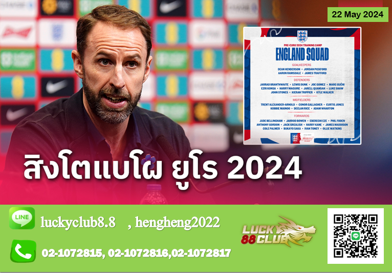 แกเร็ธ เซาธ์เกต ผู้จัดการทีมชาติอังกฤษ ประกาศรายชื่อ 33 นักเตะ “สิงโตคำราม” เบื้องต้นชุดลงทำศึกยูโร 2024 ที่ประเทศเยอรมนี ระหว่างวันที่ 14 มิถุนายน ถึง 14 กรกฎาคม ออกมาแล้ว ก่อนที่จะตัดให้เหลือไม่เกิน 26 คนภายในวันศุกร์ที่ 7 มิ.ย. นี้