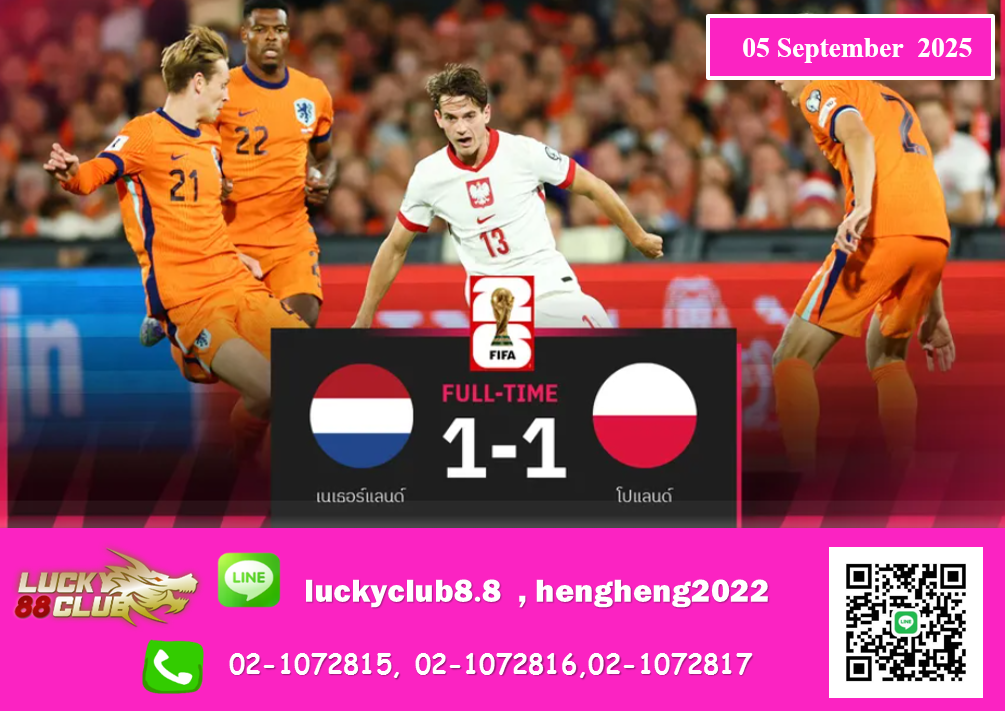 ศึกคัดเลือกฟุตบอลโลก 2026 โซนยุโรป กลุ่มจี วันพฤหัสบดีที่ 4 กันยายน 2568 เนเธอร์แลนด์ เปิดบ้านดวล โปแลนด์ โดยทั้งสองทีมมี 6 คะแนนเท่ากัน แต่ทัพดัตช์แข่งน้อยกว่า 1 นัด