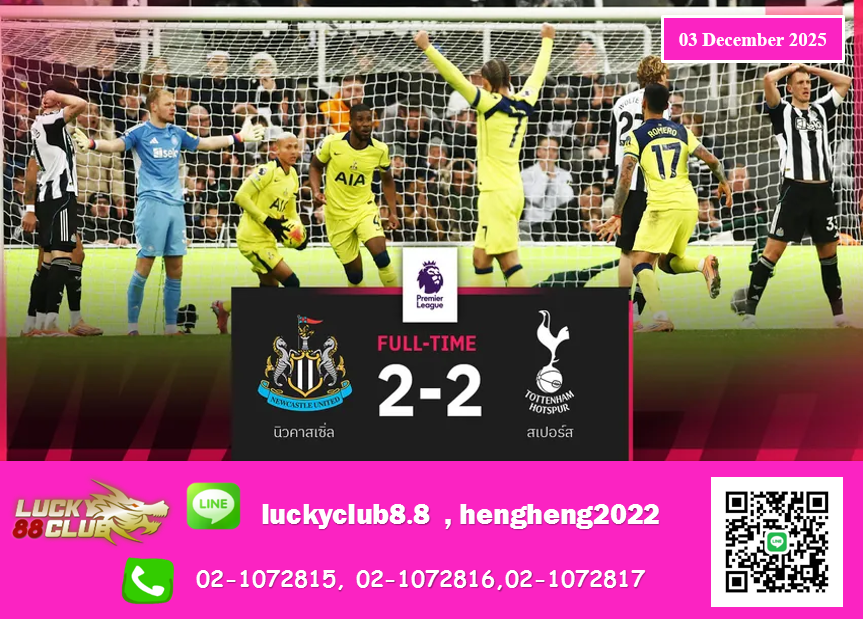 จบเกม นิวคาสเซิ่ล นำสองครั้ง แต่ไม่ชนะ ทำได้แค่เปิดบ้านเสมอ สเปอร์ส 2-2 ขยับขึ้นรั้งอันดับ 13 ในตารางคะแนน พรีเมียร์ลีก มี 19 แต้ม จาก 14 นัด ขณะที่ “ไก่เดือยทอง” ปีนขึ้นมาอยู่ที่อันดับ 11 มี 19 แต้มเช่นกัน แต่ประตูได้-เสียดีกว่าคู่แข่ง