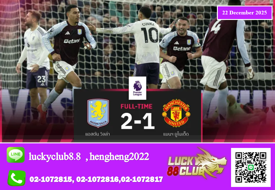 ศึกฟุตบอลพรีเมียร์ลีก อังกฤษ คืนวันอาทิตย์ที่ 21 ธันวาคมที่ผ่านมา “ปีศาจแดง” แมนเชสเตอร์ ยูไนเต็ด ซึ่งต้องการชัยชนะอย่างมากเพื่อขยันขึ้นอันดับขึ้นไปลุ้นท็อปโฟร์ มีคิวบุกเยือน “สิงห์ผงาด” แอสตัน วิลล่า ซึ่งฟอร์มกำลังร้อนแรงสุดๆ ชนะรวด 6 เกมติดต่อกันในลีก และต้องการสามคะแนนเพื่อรักษาโอกาสในการลุ้นแชมป์ลีกต่อไป