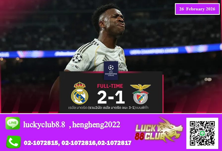 ศึกฟุตบอล ยูฟ่า แชมเปี้ยนส์ ลีก (UEFA Champions League) รอบน็อกเอาต์ เพลย์ออฟ นัดที่สอง ประจำวันพุธที่ 25 กุมภาพันธ์ 2569 เป็นการพบกันระหว่าง เรอัล มาดริด ยักษ์ใหญ่จากสเปน เปิดบ้านรับการมาเยือนของ เบนฟิก้า ยอดทีมจากโปรตุเกส
